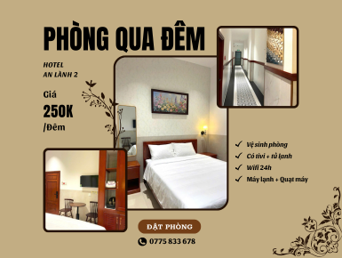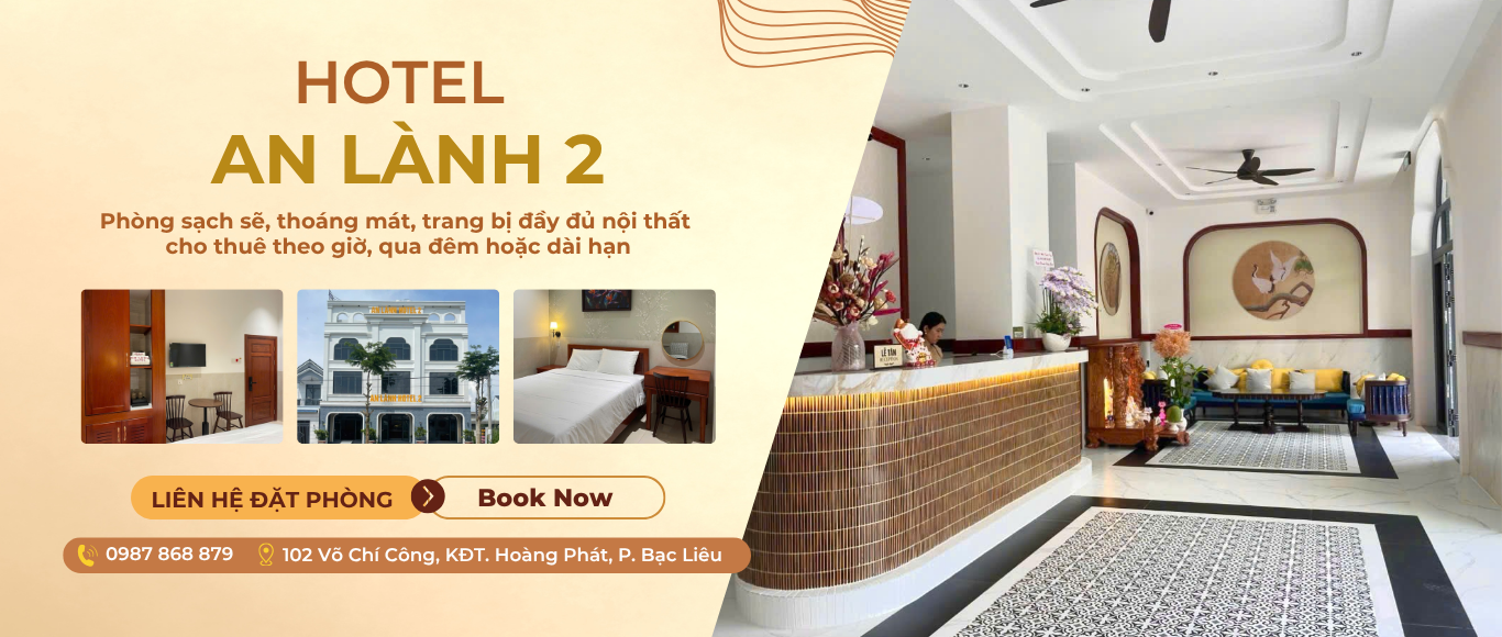 Toạ lạc ngay trung tâm Thành phố Bạc Liêu. Hotel An Lành với số lượng 13 phòng, được trang bị đầy đủ tiện nghi. có bãi đỗ xe rộng rãi, miễn phí. Bên cạnh đó, Hotel An Lành ngay trung tâm thành phố Bạc Liêu thuận tiện cho việc đi lại tham quan du lịch các địa điểm tại đây. Với lòng mến khách, tính chuyên nghiệp, linh hoạt, chu đáo của đội ngũ nhân viên phục vụ, giá cả phù hợp, Hotel An Lành tin tưởng sẽ làm hài lòng quý khách hàng khi đến !